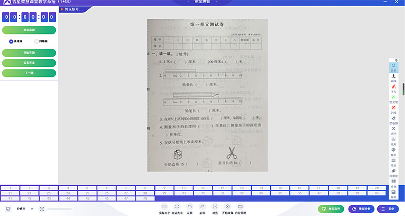 教師通過(guò)大屏展示測(cè)驗(yàn)考題,將紙質(zhì)試題轉(zhuǎn)化電子形式展示,節(jié)約成本的同時(shí)也能夠讓學(xué)生清晰地看到試題。學(xué)生通過(guò)按鈕進(jìn)行作答,大屏實(shí)時(shí)展示答題狀況。