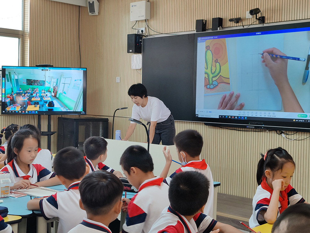 在專遞課堂的雙屏教學中,主屏可展現主分課堂的學生學習過程及細節,副屏則展示分課堂中學生學習的場景。