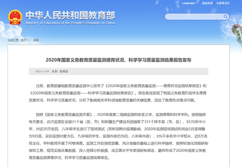 日前,教育部基礎(chǔ)教育質(zhì)量監(jiān)測中心發(fā)布了《2020年國家義務(wù)教育質(zhì)量監(jiān)測——德育狀況監(jiān)測結(jié)果報(bào)告》和《2020年國家義務(wù)教育質(zhì)量監(jiān)測——科學(xué)學(xué)習(xí)質(zhì)量監(jiān)測結(jié)果報(bào)告》。