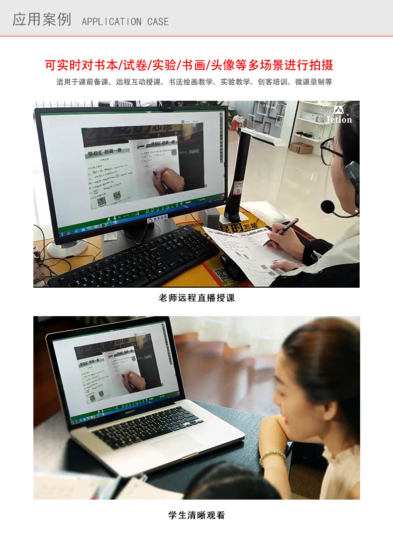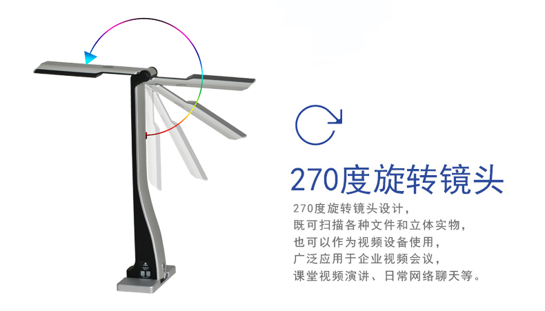 機械折臂270度翻轉式:90度可拍攝文稿;180度可拍攝課堂活動,用作簡易的錄播系統(tǒng);270度可錄制微課